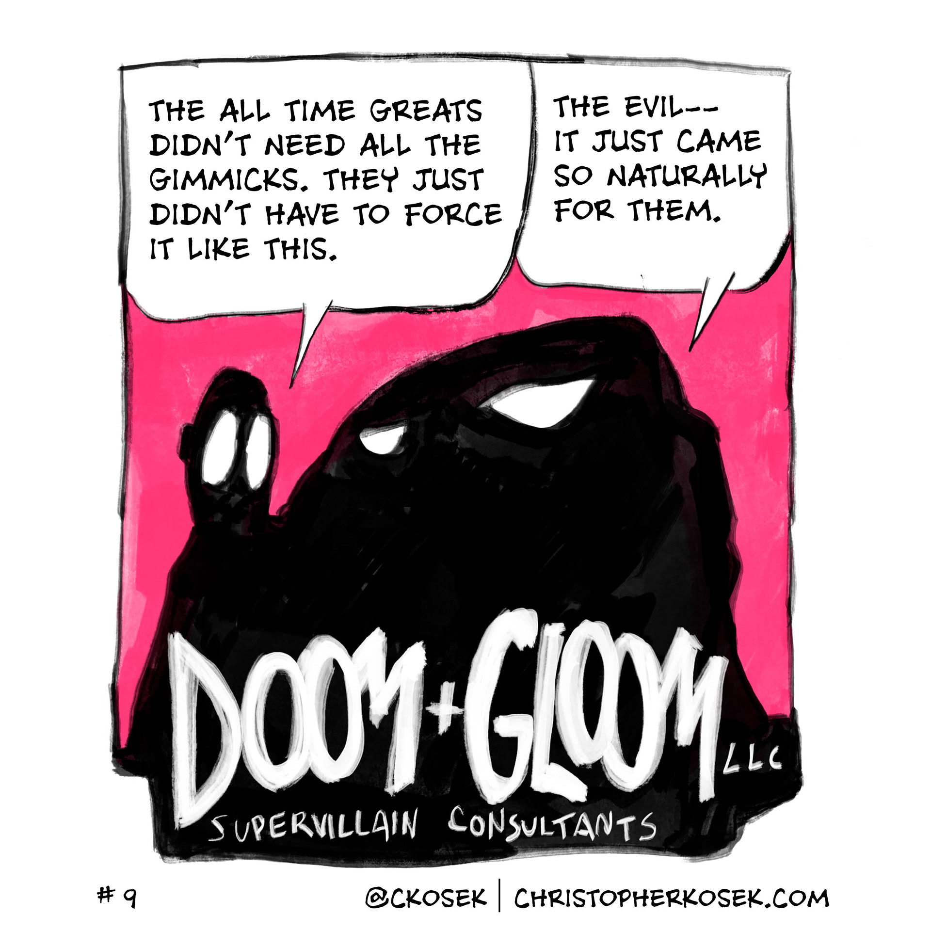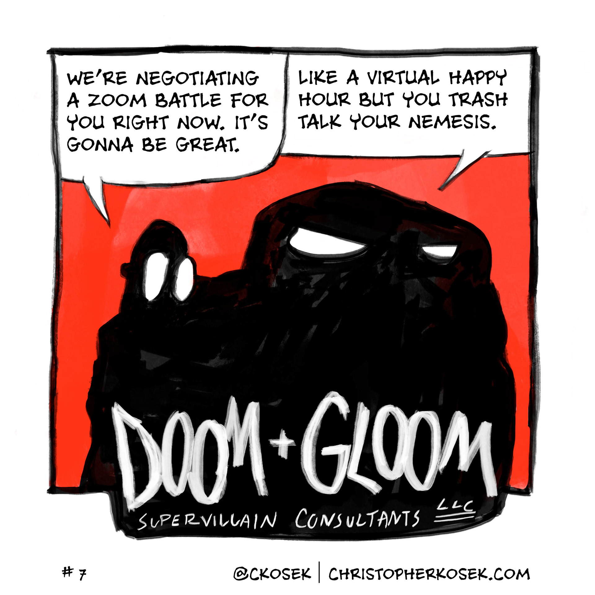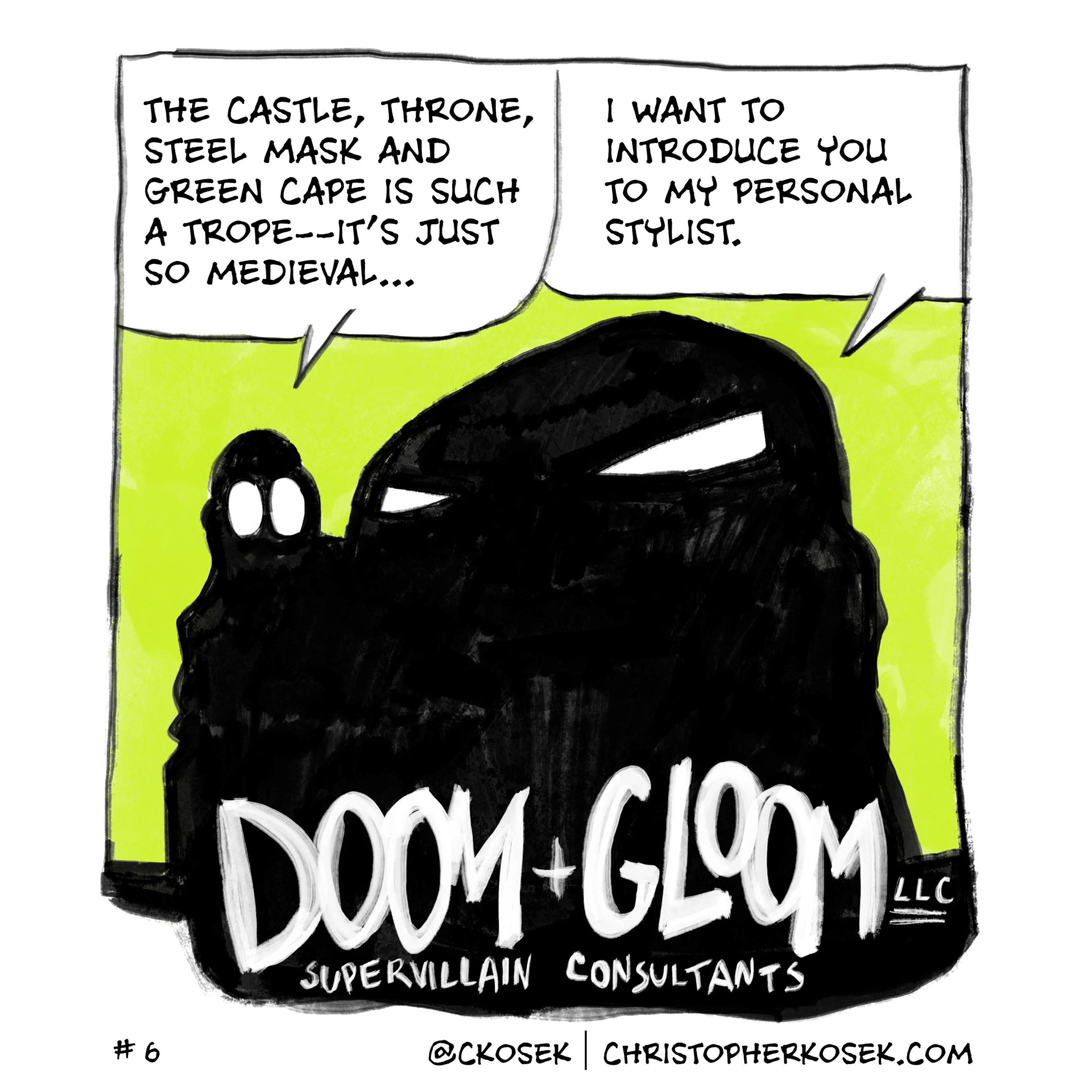 Doom & Gloom Supervillain Consultants is an instagram based webcomic strip, where we sit in on meetings with a pair of experts who advise their evil clients on how to be their worst selves...at scale.