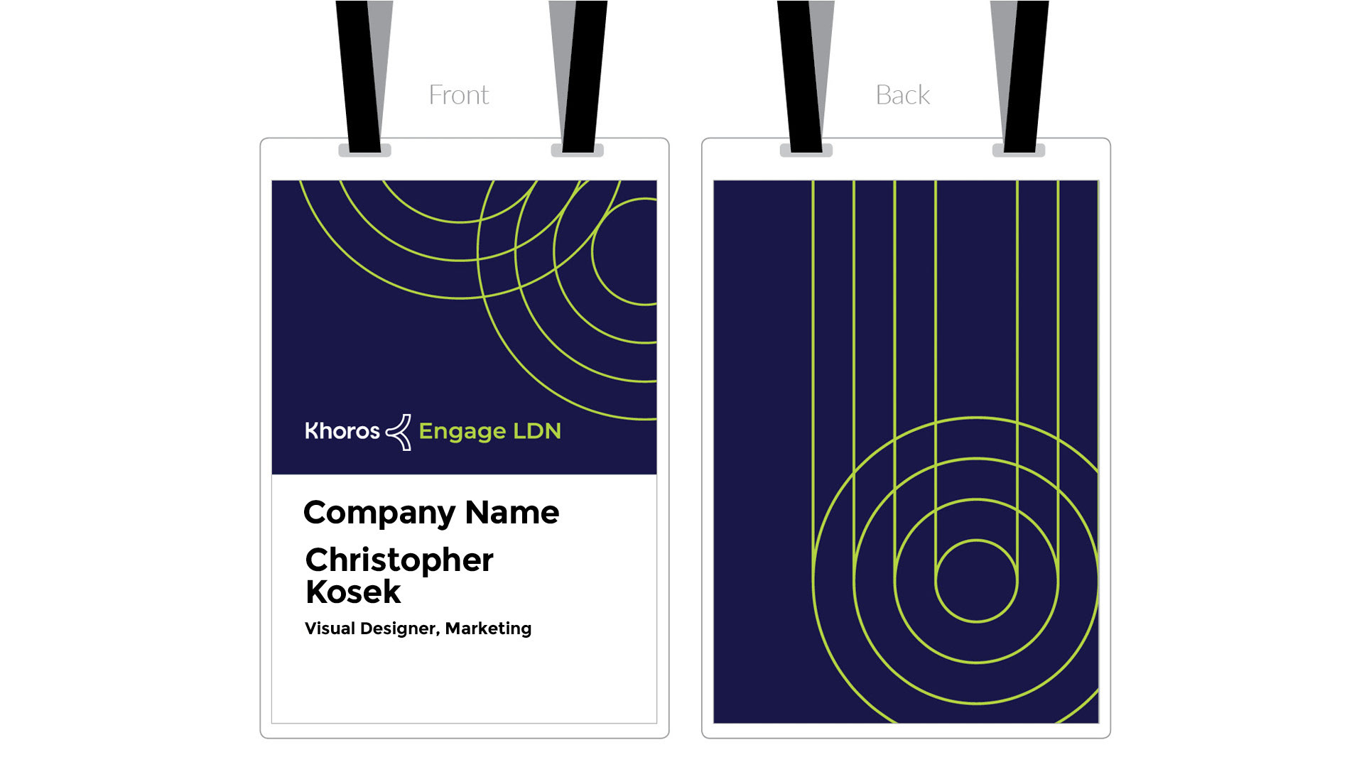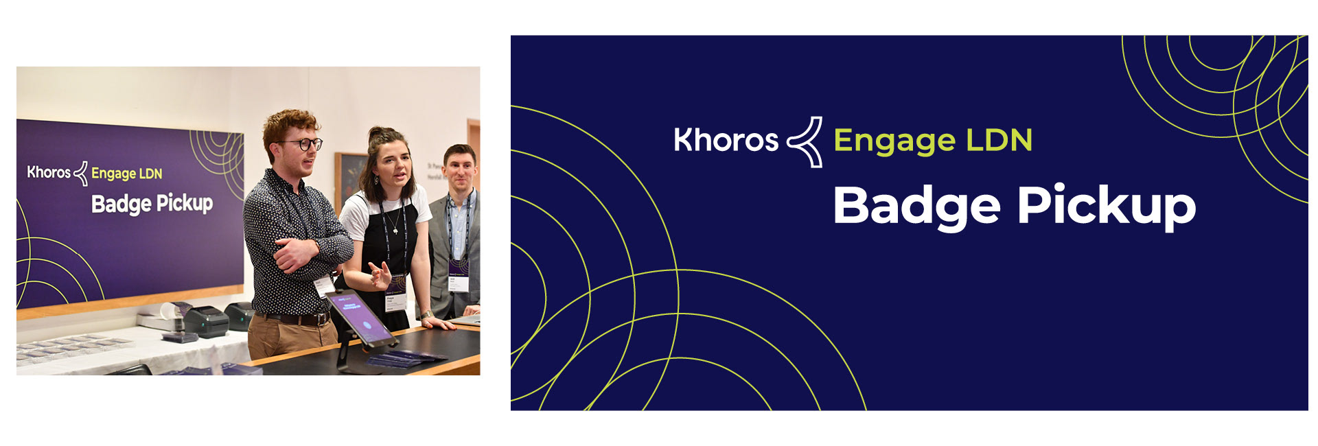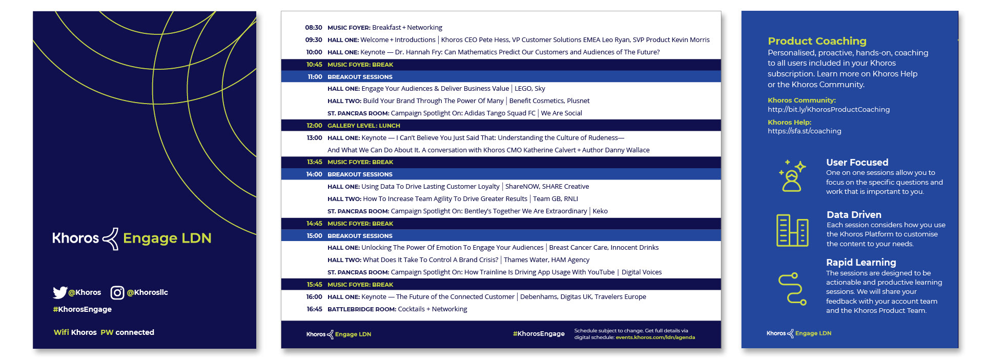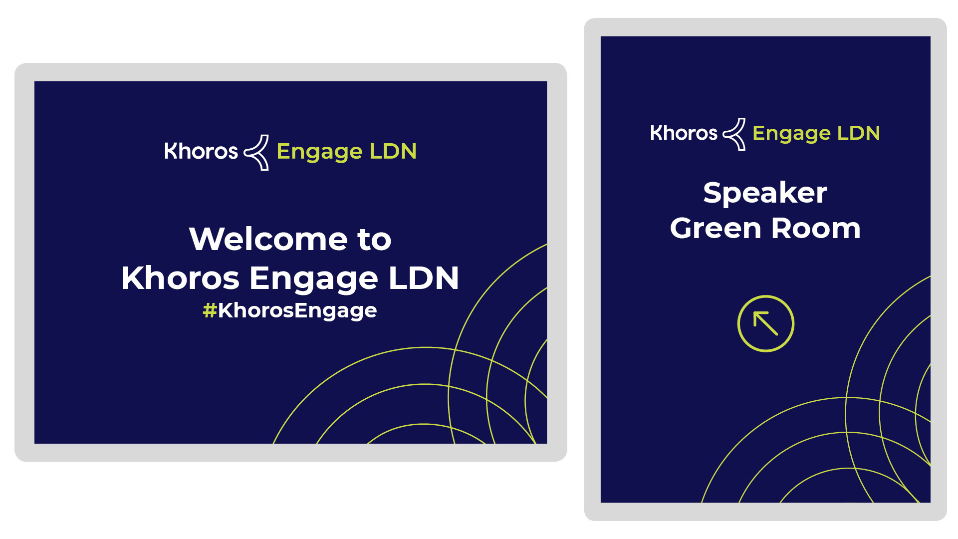 We had opportunity to utilize digital signage around the event space, and chose to use it for announcements, directionals and agenda updates. I found this was also a good opportunity to break out of the Chartreuse on Navy and introduce some of our other base colors, such as Khoros Blue and White. This provided enough design contrast to make things lively and interesting.