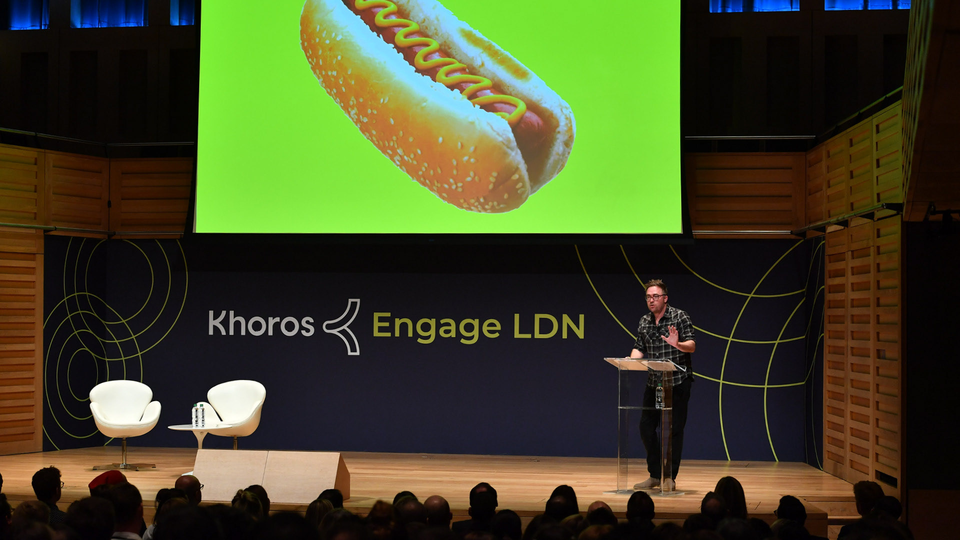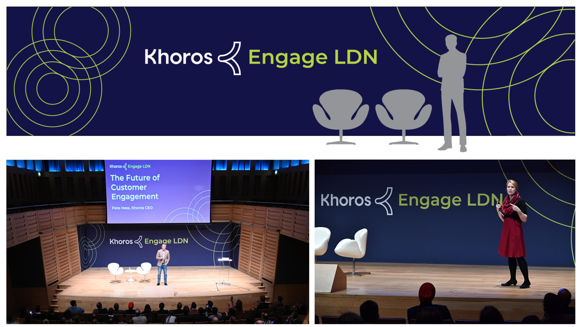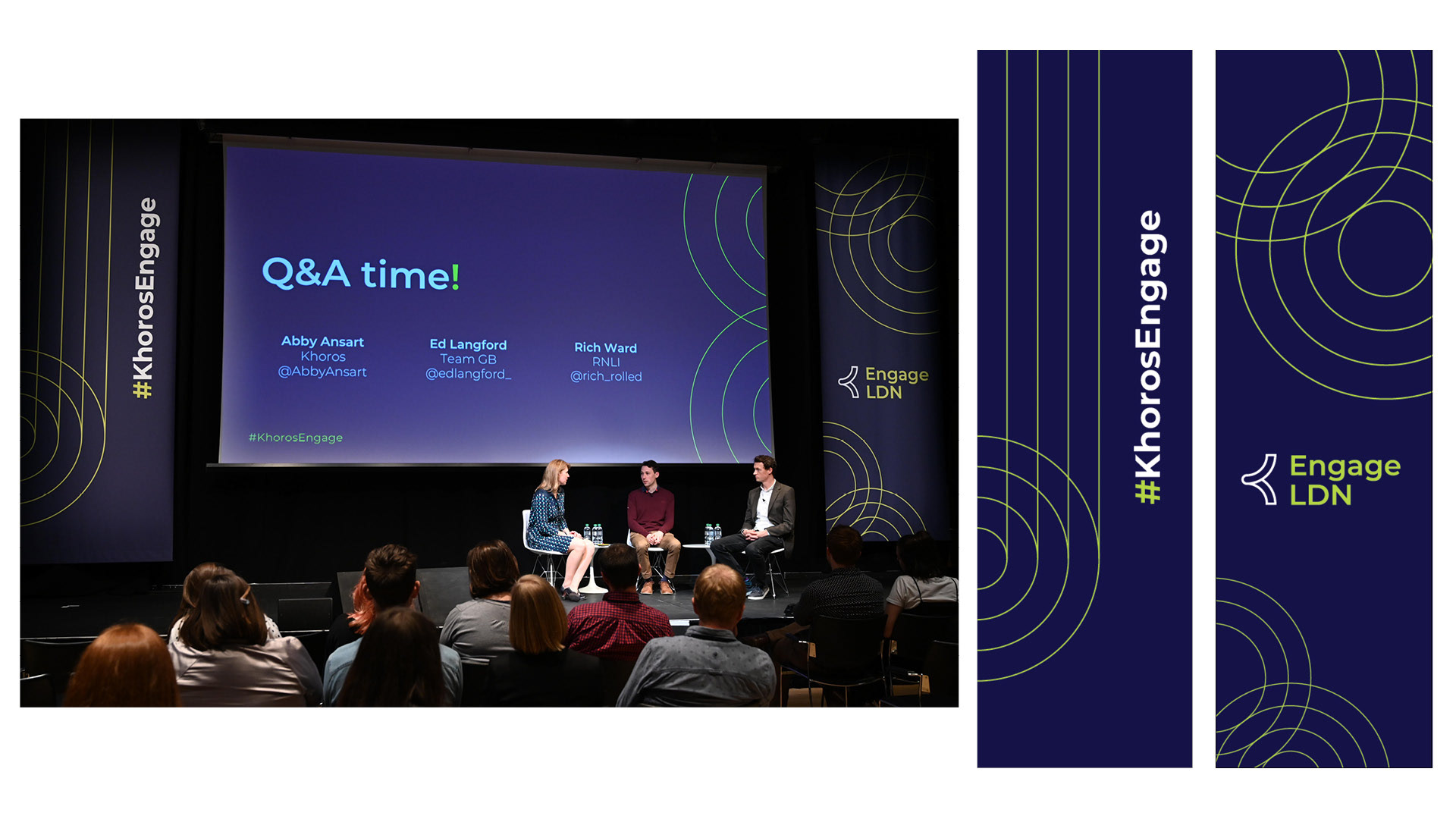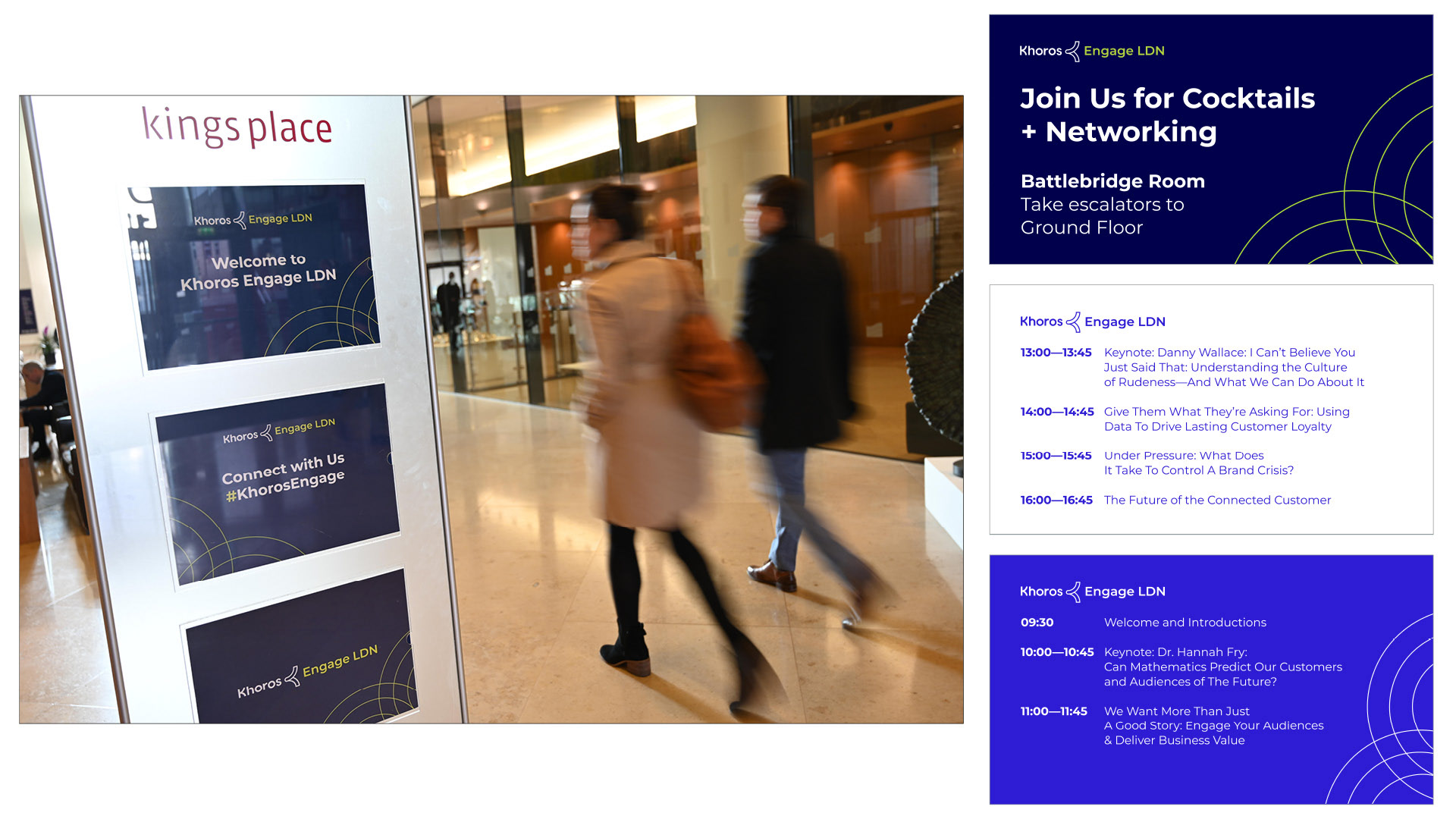 We had opportunity to utilize digital signage around the event space, and chose to use it for announcements, directionals and agenda updates. I found this was also a good opportunity to break out of the Chartreuse on Navy and introduce some of our other base colors, such as Khoros Blue and White. This provided enough design contrast to make things lively and interesting.