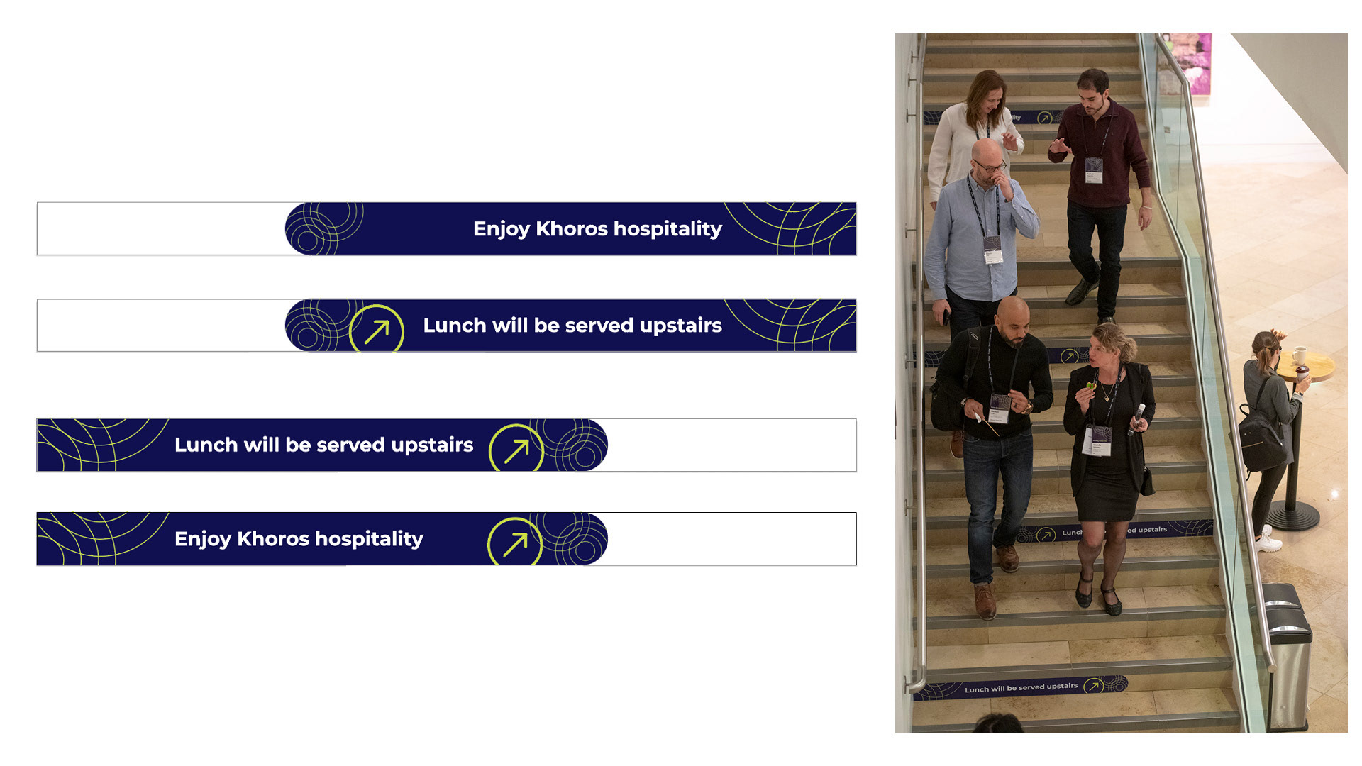 This was an interesting last minute add to our signage system. The events lead made a suggestion to use vinyl graphics on the steps after seeing another event do something similar in the space. We were limited with our opportunity for signage to direct attendees upstairs for lunch and cocktails, so the stair graphics became a key component of our way finding signage system. I repeated the simple messaging up the stair case and only covered 3/4ths of the available stair in vinyl to give some contrast against the natural stone.